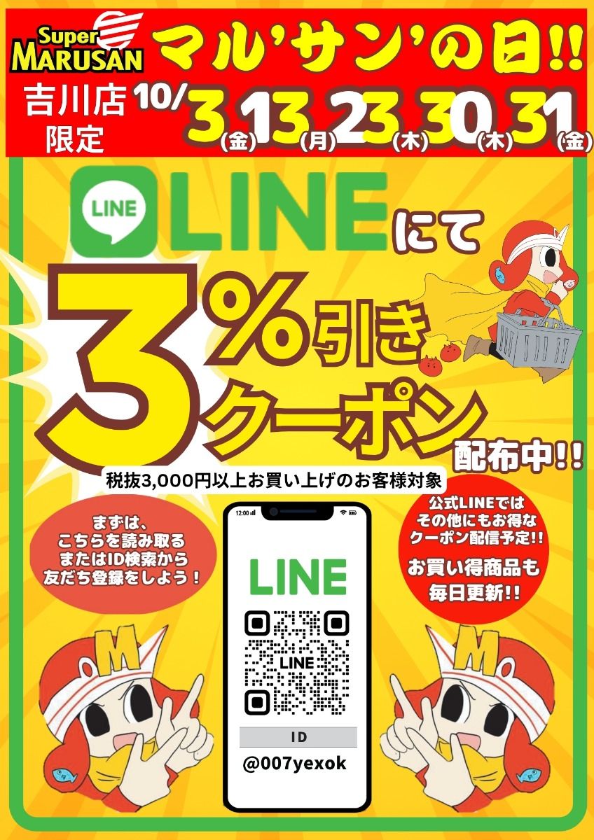 スーパーマルサン 吉川店 > お知らせ / 【吉川店限定!!】 10月は「マルサン(3️⃣)の日😂」 吉川店公式ラインアカウントでクーポン配信中!